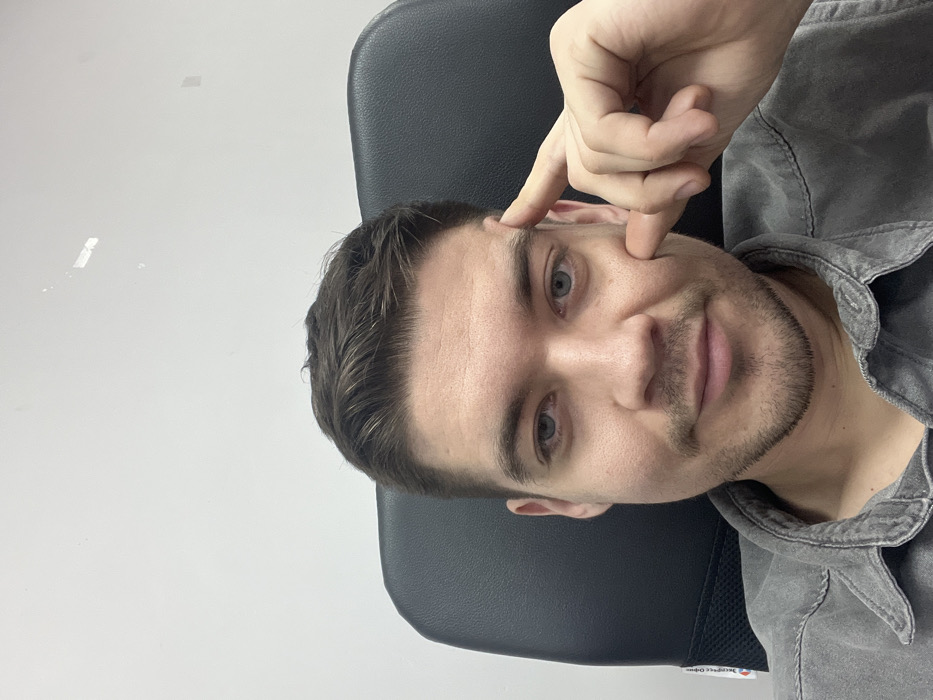 A male individual, estimated to be between 25 and 35 years old, with short dark brown hair, blue eyes, and light facial stubble, is depicted in a head-and-shoulders view