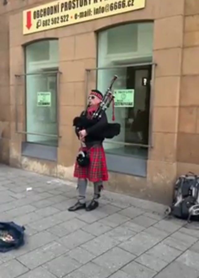 - "A person in a kilt plays the bagpipes on a sidewalk in front of a building with a sign in Czech above the storefront windows" by FM-rnmAA3, licensed under CC BY 4.0