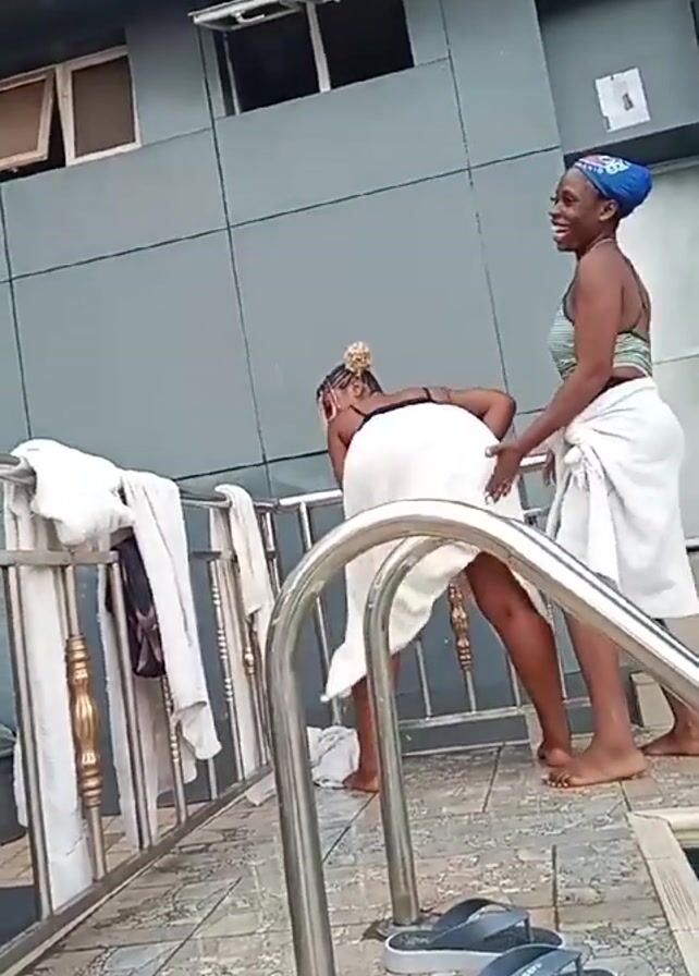 two women by a swimming pool. Both are partially covered in white towels. One woman has her back to the camera, wearing a black top and a towel wrapped around her waist. The other woman is standing behind her, smiling and with her hands on the first woman's buttocks. She wears a striped top and a blue head wrap. They are on a tiled deck next to the pool, with a metal railing separating them from the pool area. There are also several towels hanging over the railing. The background features a grey building with windows. Upbeat music plays in the background.