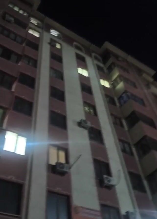 The video depicts the exterior of a tall building at night. The building has multiple floors, with rows of windows, some of which are lit. Air conditioning units are visible on the exterior walls of the building. A sign with the word "FLORENSIYA" is present. The camera pans upwards, capturing the dark sky above with a few faint stars and some wispy clouds. Bright streaks of light cross the sky, possibly from a light source or reflection.