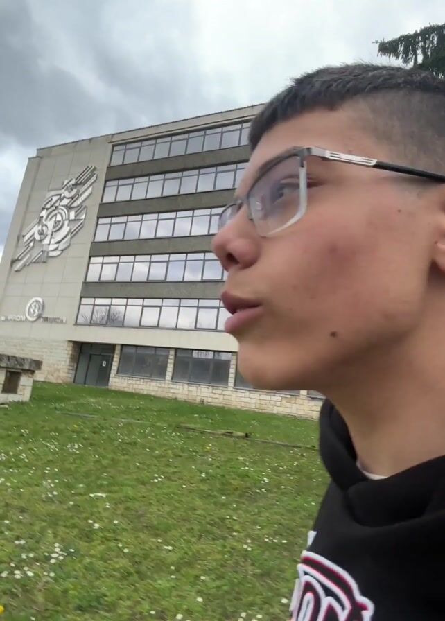 A young man is standing outside in front of a large building with multiple floors and windows. He is wearing glasses and a black hoodie with white lettering. The building has a large, abstract design on its exterior. The sky is overcast. The ground is covered in grass and some small white flowers. The man is looking to his right.