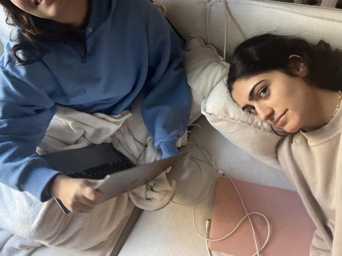 The scene depicts two individuals in a domestic interior setting, consistent with a residence in Paris, France, although no specific Parisian landmarks are visible. Both individuals appear to be young adult females. On the left, a female is seated or semi-reclined, wearing a light blue hooded sweatshirt with a small white tag on the upper chest. She is partially covered by a light-colored blanket. Her hands are positioned around the screen of an open, dark-colored laptop resting on her lap. On the right, a second female is lying on her left side on a light-colored sofa, with her head resting on a white pillow. She has dark hair and eyes and is looking directly at the camera. She wears a light beige long-sleeved sweatshirt and a thin chain necklace. A closed, pink-colored laptop rests on the sofa beside her, with white charging cables visible and partially tangled nearby. The overall environment suggests a casual and relaxed indoor atmosphere.