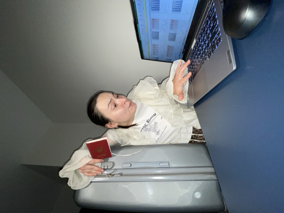 A woman with dark hair pulled back works on a laptop placed on a desk or table. She wears a white ruffled top and sits behind a silver suitcase, with a red passport resting on it. The laptop screen displays graphs, and a black wireless mouse sits beside it. The scene is captured from a low angle, looking upward.