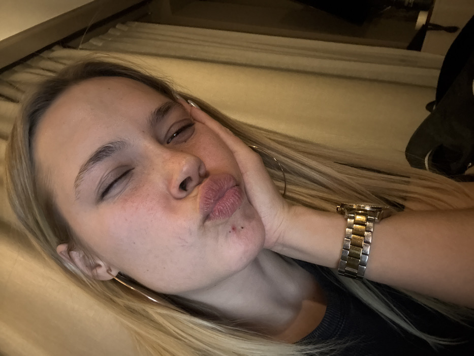 A blonde woman with freckles poses closely for a selfie. She has her eyes closed, puckers her lips, and rests her face against her hand. A gold watch is visible on her wrist and a large gold hoop earring is in her ear. She wears a black shirt, and light from above illuminates her face. White curtains and other household objects are visible in the background.