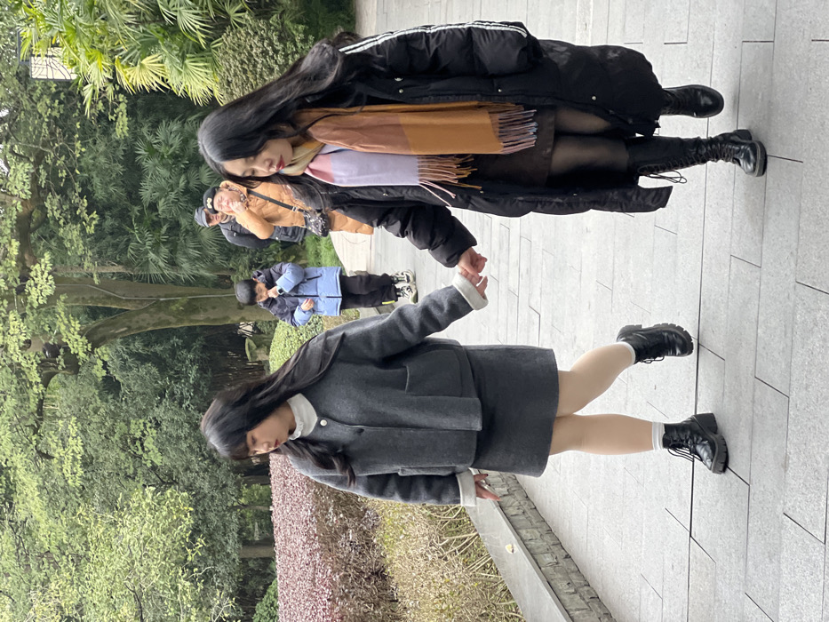 Two women are walking side by side along a paved path in a park setting. One wears a long black puffer coat and a colorful scarf, along with knee-high black boots. The other is dressed in a gray suit with a short skirt, white socks, and black combat boots. In the background, other people can be seen, including a group with cameras, and various trees and bushes line the path. The image is taken from a slightly low angle, giving a sense of depth.