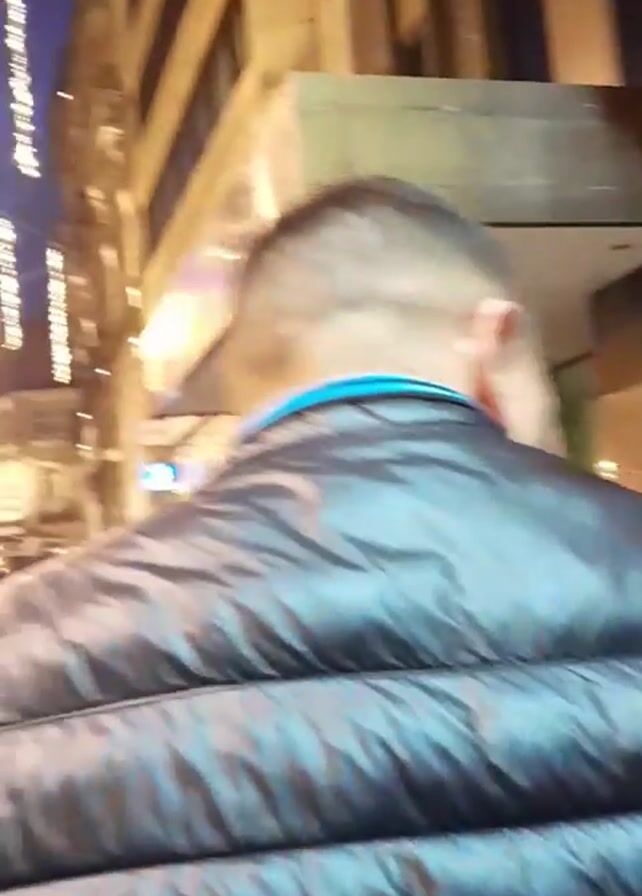 street scene at night, likely during the holiday season. The camera holder follows someone wearing a dark puffer jacket and blue pants. The shot occasionally reveals a decorated street with Christmas lights and a large, brightly lit Christmas tree in the distance. Other people are walking on the street. Another person in a light-colored jacket and glasses is briefly visible. The ground appears wet, possibly from rain.