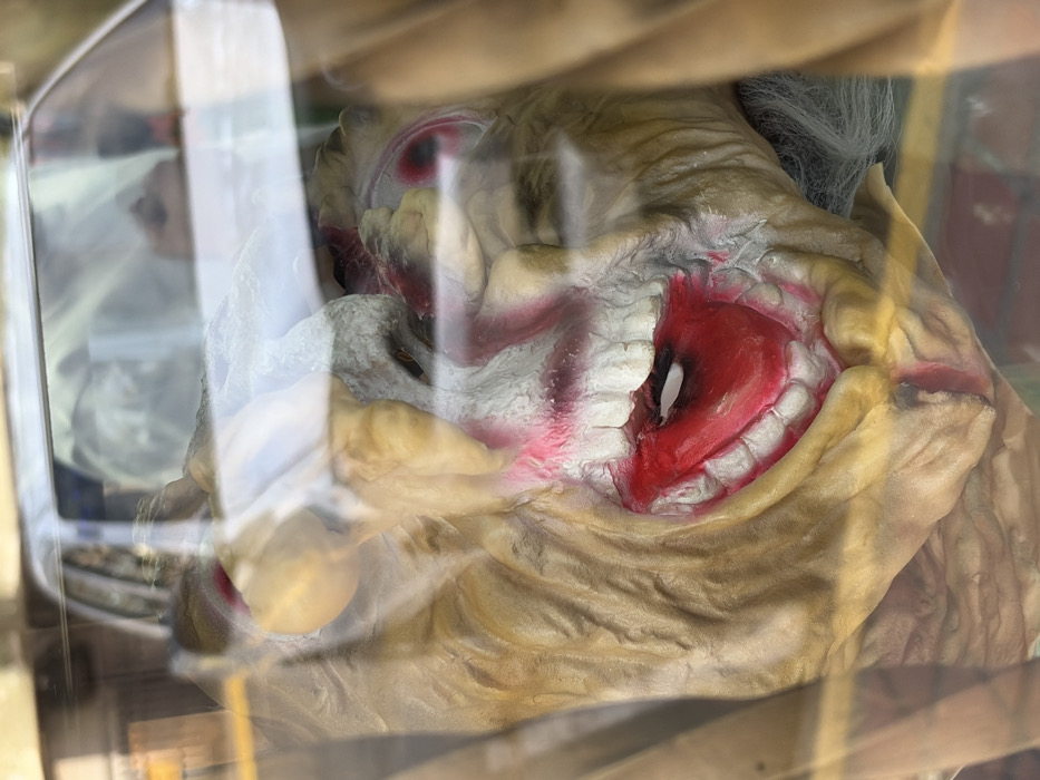 The image displays a close-up of a yellowish-beige, wrinkled mask featuring a wide-open mouth with prominent white teeth and a large, vivid red tongue. Red and pink coloration, resembling either cosmetic application or simulated blood, is visible around the mouth and a darkened, hollowed eye socket. Strands of grey hair are present on the mask's right side. The mask is viewed through a reflective glass surface, which partially obscures it with reflections of what appears to be a vehicle's interior, possibly a dashboard or windshield frame, and indistinct external elements. No individuals or dynamic actions are visible. The depicted scene is located in Guayana City, Venezuela.
