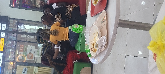 Four women sit near a window with a mobile phone store display. One woman wears a yellow shirt and braids. Another wears black and white. One is in red pants. A white round table with used dishes and water bottles is next to them. A yellow bag sits on the floor. The window display shows mobile phone brands like Nokia, Realme, Tecno, and Xiaomi.