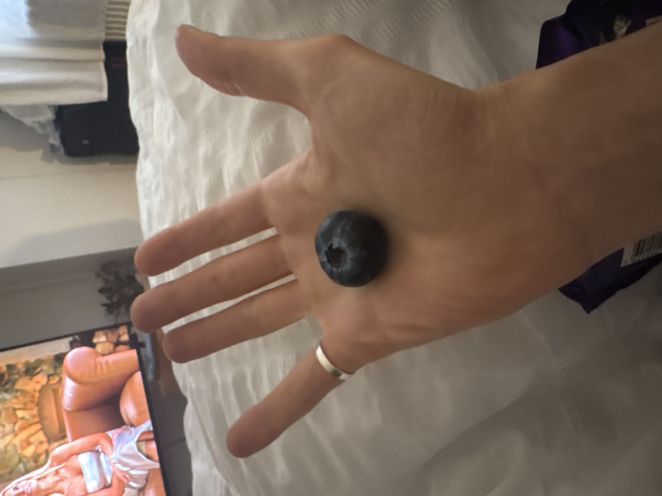The image displays a human left hand, palm up, holding a single, dark blue blueberry centered in the palm. A plain, silver-colored band ring is worn on the ring finger. The hand rests on a rumpled, light-colored fabric surface, consistent with a duvet or bedsheet. In the blurred background to the left, a television screen is visible, showing a blonde woman in a light-colored strapless garment seated on an orange-brown armchair, with a decorative stack of logs and a plant behind her. The background to the right reveals a light-colored wall, a radiator, and a dark object, possibly a bag or suitcase. A corner of a purple wrapper with white text is partially visible in the lower right foreground. The scene is set indoors, likely in a private residence, within the city of London, United Kingdom.