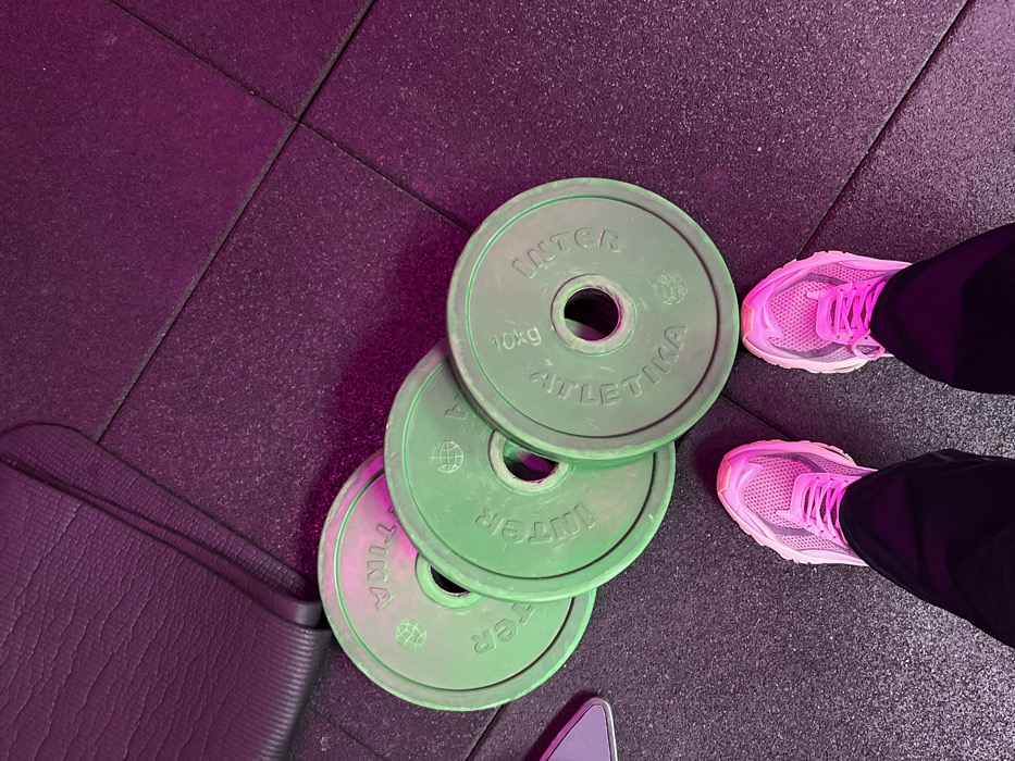 A first-person, top-down view depicts a scene within a fitness facility in Lymanka, Ukraine, under strong pink-purple illumination. The floor consists of dark, textured, interlocking rubber gym tiles. Three green, circular weight plates, manufactured by "INTER ATLETIKA" and one visibly marked "10kg," are positioned side-by-side on the floor in the mid-ground. In the lower frame, a person's feet are visible, wearing black athletic pants and pink and white athletic sneakers. A dark, textured surface, consistent with gym equipment such as a bench, is partially visible in the upper left corner of the frame.
