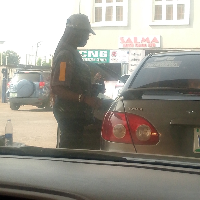The image displays an outdoor automotive service area identified as "SALMA AUTO CARE LTD" and a "CNG CONVERSION CENTER" in Karmajiji, Abuja, Nigeria. This location is confirmed by signage on a white building and a visible Nigerian license plate "KUJ-765FY" on a blue SUV in the background. In the mid-ground, a person, likely a woman, wearing a dark cap, a dark short-sleeved uniform shirt with a vertical yellow stripe on the upper left arm, and dark pants, stands alongside the rear passenger side of a grey Toyota sedan. Her hands are engaged with the vehicle, suggesting an action such as fueling or servicing. The grey Toyota features a rear spoiler, "TOYOTA" badging, and a "KOINONIA" sticker on its rear window, with a partial Nigerian license plate starting with "Y". The blue SUV in the background has a spare tire mounted on its rear hatch. A clear plastic water bottle with a blue label rests on a surface in the immediate foreground, indicating the photograph was taken from inside another vehicle. The ground is paved, and the scene is brightly illuminated by daylight.