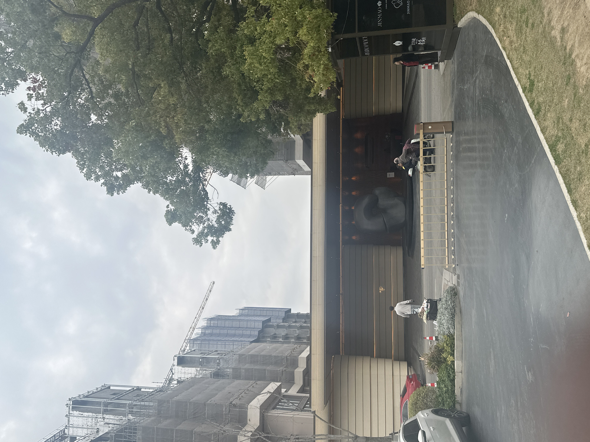 This image depicts the entrance of a building complex identified as "JINMAO PALACE" in Jiangning District, China, under an overcast sky. **Environment:** The forecourt consists of dark grey asphalt, appearing slightly wet in areas. A landscaped island with shrubs and low-lying plants is centrally located. To the right, a patch of green grass is visible. A large, leafy deciduous tree occupies the upper right frame. On the left, bare trees line the roadside. In the background, multiple high-rise buildings are under construction, enveloped in grey scaffolding and netting, with a tower crane extending over them. **Main Structure:** The central building features a wide, horizontal facade with light beige/brown paneling, transitioning to darker grey panels around a recessed main entrance. A large, dark, abstract sculptural element is positioned within this recess. Above the entrance, a subtle illuminated 'P' symbol is visible. To the right, a vertical black sign with white text reads "JINMAO PALACE" and "CHINA JINMAO." **Objects:** * A white SUV (possibly Volkswagen) is partially visible on the far left. * A red car (possibly Tesla Model 3) is parked behind the white SUV. * A light-colored, horizontal security barrier/gate with a dark brown post is present in the middle ground, blocking vehicular access. * Two orange and white traffic cones are on the landscaped island. * A black wheeled cart, laden with miscellaneous items, is positioned near the island. * A three-wheeled electric scooter is stopped at the barrier. **People and Actions:** * A male individual, wearing a light grey long-sleeved top and dark trousers, is walking towards the main building entrance, pushing the black wheeled cart. * Two individuals are seated on the three-wheeled electric scooter at the security barrier, facing the building. The driver wears a dark jacket. * A female individual, wearing a red top and dark trousers, stands to the right near the "JINMAO" sign, facing towards the left side of the scene.