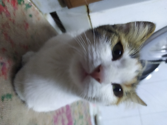 A domestic cat is depicted in a medium-shot portrait, centered within the frame and facing directly towards the camera. The animal exhibits a tricolor fur pattern, primarily white on its chest and lower face, with distinct brown, tan, and dark tabby markings on its forehead, ears, and cheeks. Its eyes are dark, with visible pupils, and its nose is pink. White whiskers extend from its muzzle. The cat is in a seated or loafing position, with its front paws tucked beneath its body, resting on a floor covering. This covering is a patterned rug or carpet, displaying muted colors including beige, green, and faded pink/red elements. The background consists of a light-colored wall or vertical surface to the left and rear, with out-of-focus metallic or reflective objects visible in the upper background, potentially suggesting an indoor household environment. The lighting appears artificial. The image captures the scene in a specific indoor location within Harasta, Syria.