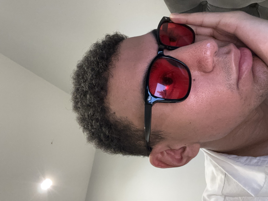 A male individual with short, dark, curly hair is depicted in a close-up, indoor setting. He is wearing black-framed sunglasses with opaque red lenses that obscure his eyes. His left hand is resting against the left side of his face, with fingers supporting his chin and cheek. He is wearing a light-colored, collared shirt. The background consists of a plain white ceiling with a bright, circular ceiling light fixture visible in the upper left, producing a strong glare. No specific architectural features or external elements are present to identify the precise location. The specific location within London, United Kingdom, cannot be determined from the image.