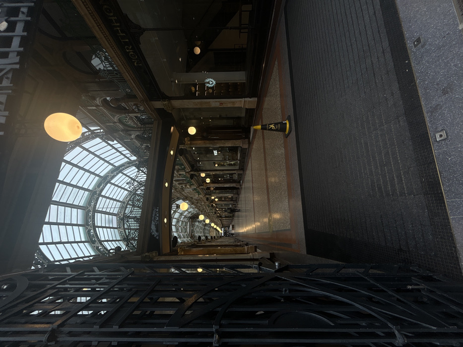 The image depicts the interior of a grand, ornate shopping arcade, specifically identified as part of Victoria Leeds (Victoria Quarter), likely the County Arcade or Cross Arcade, in Leeds, West Yorkshire, United Kingdom. The view is from just inside a partially open, dark, decorative metal gate, which occupies the left foreground. The arcade extends into the distance, characterized by a high, arched glass roof supported by intricate dark metal framework and lighter-colored structural elements. Numerous large, spherical light fixtures, emitting an amber glow, hang at regular intervals from the ceiling structure, supplementing natural light filtering through the glass roof. Recessed lighting is also visible in lower ceiling panels. The floor in the immediate foreground consists of a dark, ridged matting section, transitioning into a polished terrazzo pathway. This pathway is composed of light-colored, rectangular tiles with dark border strips running the length of the arcade. A black and yellow "WET FLOOR" cone, featuring a black slipping figure icon and "WET FLOOR" text, is positioned on the polished floor to the right of the central path. Both sides of the arcade are lined with two levels of commercial storefronts. The ground floor presents large glass display windows, while the upper level features ornate iron railings, architectural arches, and balconies. A sign displaying "NORTH HOME" is visible above the upper-level shops on the right side of the arcade. Most shop windows appear dark, indicating they are likely closed. One individual, indistinct in features, is visible in the far distance, walking away from the camera, centrally located on the arcade path. The scene is largely devoid of other people or activity.