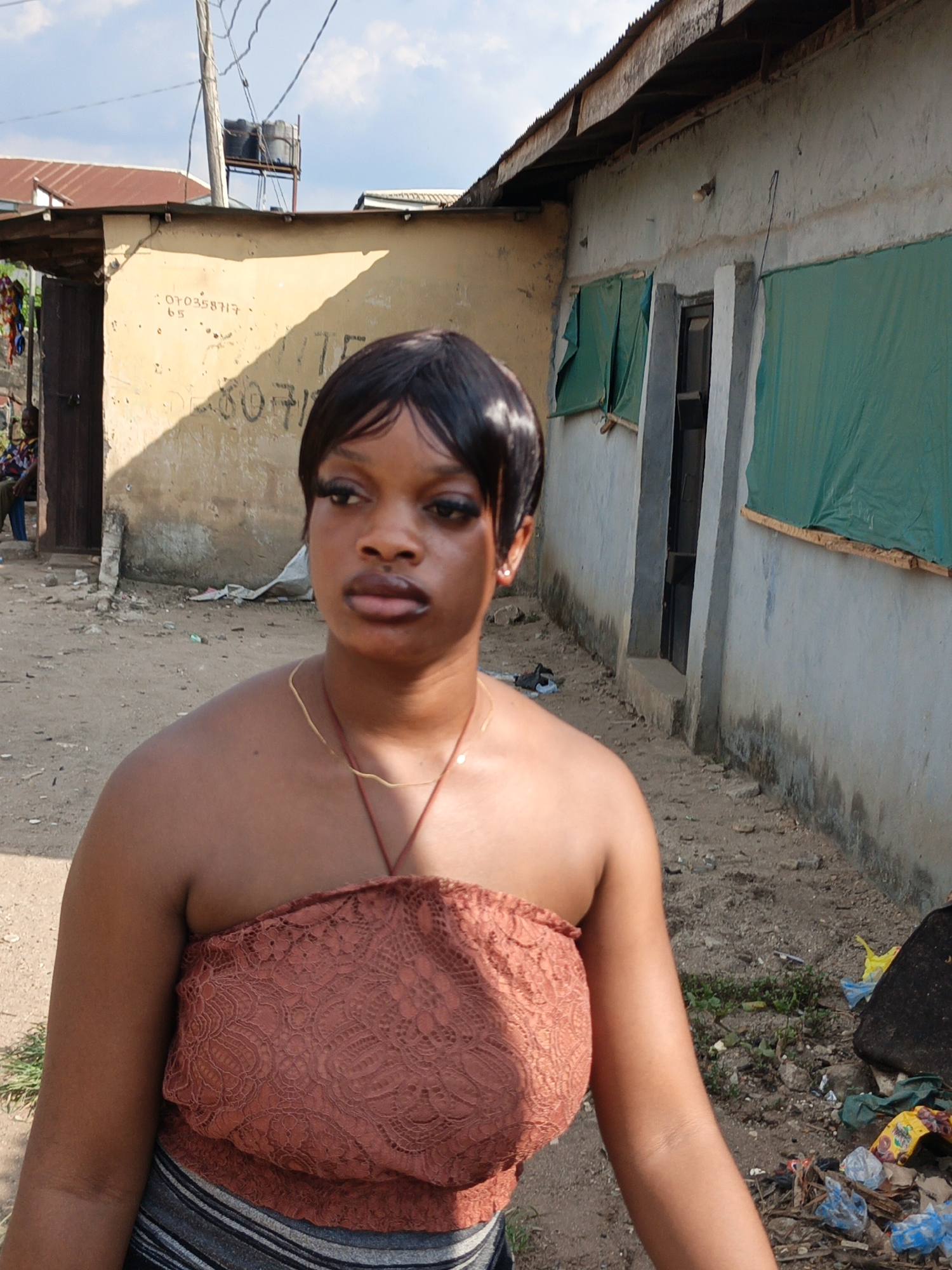 The image depicts a female subject standing outdoors on an unpaved dirt surface within an unspecified urban environment. The woman has dark skin, short dark hair with bangs, and wears heavy eye makeup with prominent eyelashes. Her lips appear full. She wears small stud earrings and two necklaces: a thin gold-colored chain and a lower dark reddish-brown cord. Her attire consists of an orange-red strapless top with a lace pattern and a lower horizontally striped garment, likely a skirt or trousers. The immediate ground is littered with plastic bottles, bags, rocks, and other debris. In the background, under a bright, partly cloudy sky, are two single-story buildings. To the subject's left is a light beige building with a dark wooden door and a corrugated metal roof. Scrawled numbers, including "070358717" and "65", are visible on its sunlit wall. Another individual wearing a patterned shirt is seated near this door. To the subject's right is a light grey building, also with a corrugated metal roof. Its windows are covered with draped green tarps or fabric, secured by wooden slats. A dark-framed doorway is present between two concrete support pillars, and the lower section of this wall exhibits dark discoloration. Overhead, a wooden utility pole with multiple wires is visible. Two dark plastic water tanks on a metal stand are observed on the roof of a more distant building. Strong sunlight from the upper left casts distinct shadows across the scene.