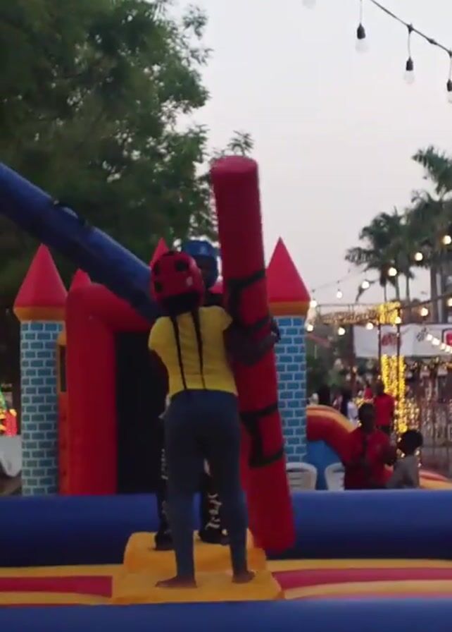 In the outdoor video, two individuals are engaged in a playful duel on an inflatable platform. The platform, striped in blue and red, features a yellow pedestal in the center where the two participants stand. They are both wearing protective helmets, one red and one blue, and wielding oversized padded batons, also red and blue. The individual in the yellow shirt is positioned with their back to the camera, while the other person is visible in front of them, swinging the padded batons. In the background, there is a colorful inflatable castle. Other people are visible in the far background, some sitting. Decorative string lights hang overhead, adding to the festive atmosphere. A lush green tree is on the left and palm trees are on the right.