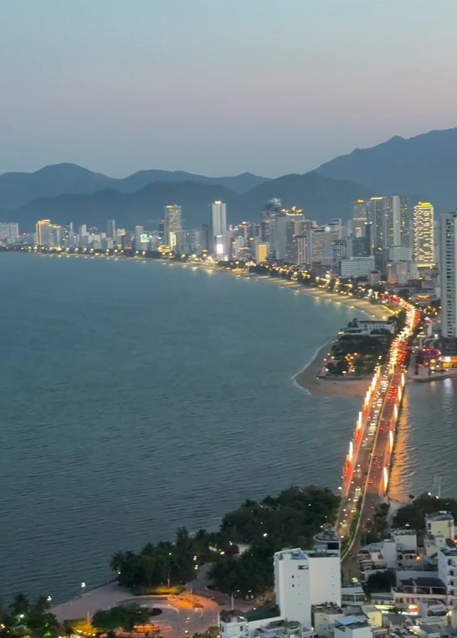 high-angle, static shot of a cityscape at dusk. A bridge extends across a body of water, connecting two parts of the city. The bridge is brightly lit with traffic moving across it. The city is densely populated with buildings, including high-rise structures, many of which are illuminated. A sandy beach lines the coast along the edge of the city. In the background, mountains rise against the evening sky. The light is soft, indicating the transition from day to night. The water is calm, reflecting the city lights. The foreground features closer buildings with lit streets.