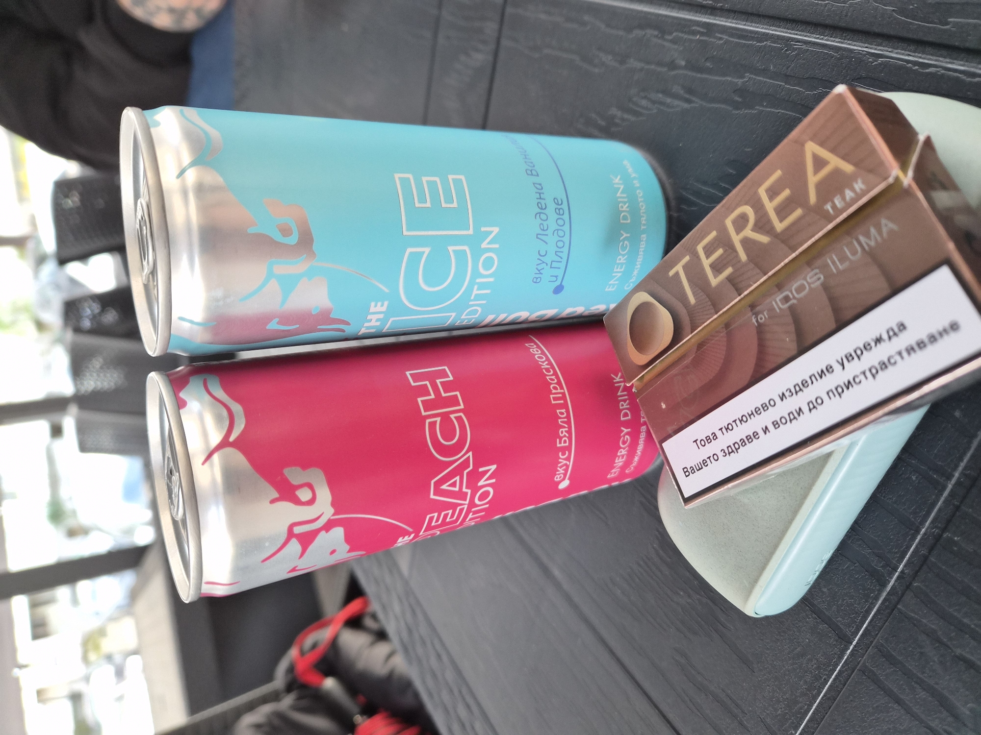 Here is a detailed description of the image: The image shows a tabletop scene, likely in a public space given the variety of objects and partial view of people in the background. The primary items are two Red Bull energy drink cans: one blue and silver ("Ice Edition") and one pink and silver ("Peach Edition"). Next to them, and partially resting on the blue can, is a pack of "TEREA TEAK" tobacco sticks for IQOS ILUMA, with a Bulgarian warning label. A light blue, smooth, rounded object (possibly a case or holder) is visible under the pack of sticks. The tabletop appears to be a dark wood or laminate surface. In the background, there is a glimpse of outdoor lighting, furniture suggesting a cafe or patio, and partial views of people wearing dark clothing, including a red strap or accessory. The setting is probably Plovdiv, Bulgaria, based on the Bulgarian language on the tobacco label and the general style of items visible.