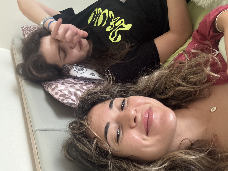 This image depicts two females indoors, presumed to be in a bedroom setting, located within the city of Kalyvia Thorikou Municipal Unit, Greece