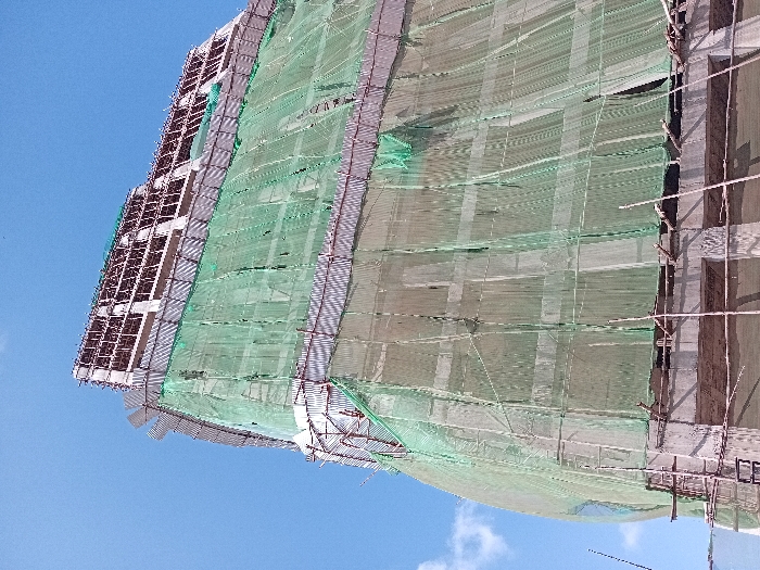A multi-story concrete building under construction in Embu, Kenya, is depicted from a low-angle perspective, pointing upwards towards a clear blue sky with scattered white clouds. The upper sections of the structure reveal exposed concrete slabs, columns, and extensive reinforcing steel bars, indicating incomplete floors. The majority of the visible building facade, particularly from the mid-level downwards, is enveloped in green safety netting, secured by an external scaffolding system composed of vertical and horizontal poles, some appearing to be timber. The building's left side exhibits a noticeable outward curve. No individuals, active machinery, or vehicles are present within the frame. The scene presents a static view of a large-scale construction site.