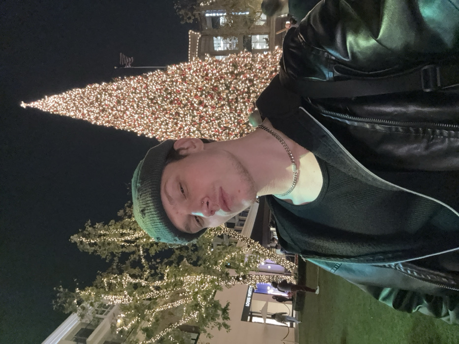 - "A man with a beanie, chain necklace, and leather jacket poses with a Christmas tree and lights in the background" by FM-zH4kC3, licensed under CC BY 4.0