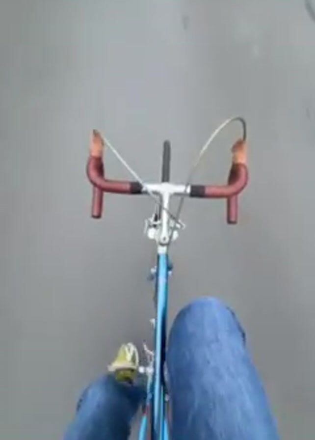 first-person perspective of someone riding a blue and silver road bicycle on a gray paved surface. The rider is wearing blue jeans and light green shoes. The bicycle has drop handlebars wrapped in textured brown tape. A bicycle wheel is visible with a yellowed tire. The rider is actively pedaling the bicycle. The background consists of a smooth, gray surface, presumably a road or path.