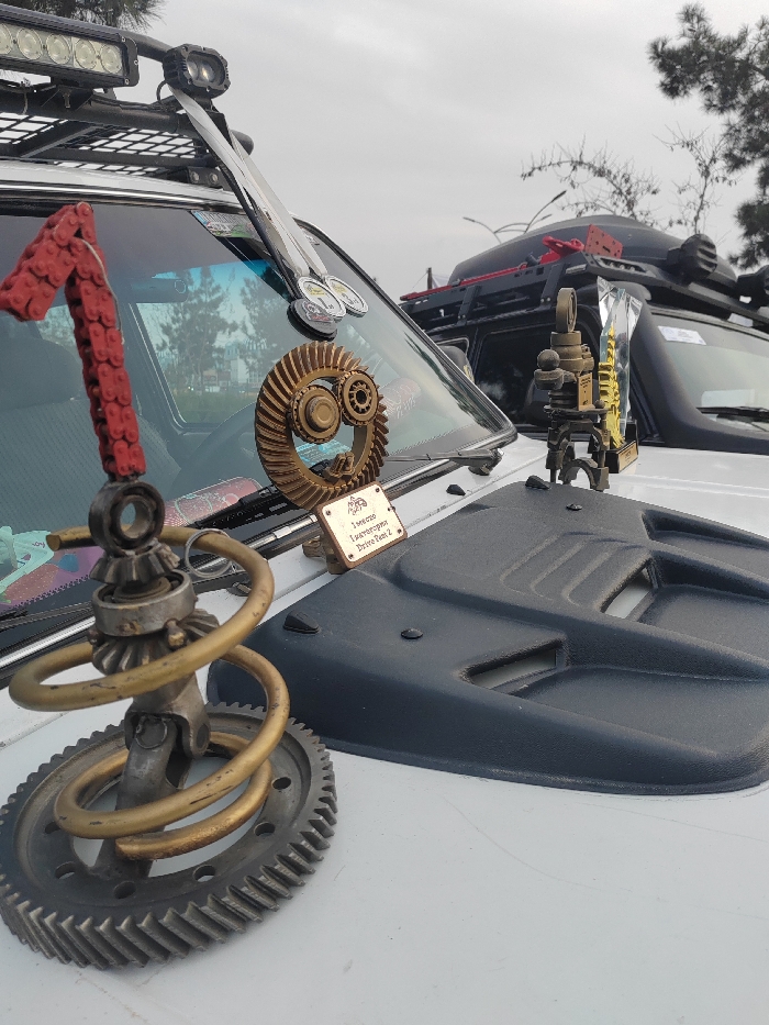 The image depicts the front portion of a white off-road vehicle, likely an SUV, parked outdoors under an overcast sky. The vehicle's hood is white, featuring a dark grey or black plastic air intake scoop. The lower section of the windshield is visible, showing a slight blue tint. A black roof rack, equipped with multiple rectangular LED light bars and one circular LED light, is mounted above the windshield. Several decorative objects and trophies are displayed on the vehicle's hood and windshield. On the left side of the hood, a prominent red-painted numeral "1," constructed from what appears to be bicycle chain links, stands on a metallic base composed of gears and a brass-colored spiral element. On the windshield, three circular medals with ribbons hang from the top edge. Below these, a brass-colored gear, configured to resemble a face with two smaller bearings as eyes, is positioned upright. Adjacent to this on the hood, a small rectangular brass plaque bears text partially visible as "1 место" (1st place) and "Ландровер Драйв Парк 2" (Land Rover Drive Park 2). Further to the right on the hood, a metallic sculpture, resembling an abstract trophy crafted from various mechanical parts, stands alongside a clear acrylic or glass plaque. In the background, to the right and slightly behind the white vehicle, a dark-colored off-road vehicle is visible. It also features a black roof rack with a red shovel mounted on it and what appears to be a black cargo box. Distant trees with sparse foliage are visible against the light grey, overcast sky. The scene is consistent with an outdoor vehicle show or competition. The specific location is an outdoor venue in Namangan City, Uzbekistan, identified by the displayed plaque as the site of "Land Rover Drive Park 2."