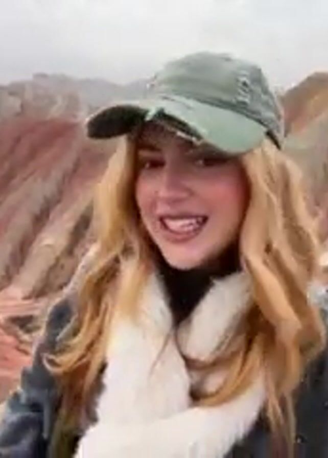 A young woman with long, wavy, strawberry-blonde hair is standing on a wooden deck with a railing, facing the camera. She is wearing a gray sweater, a white faux-fur scarf, and a distressed green baseball cap. Behind her is a breathtaking landscape of rolling hills in various shades of red, orange, and beige. In the distance, a body of water can be seen nestled between the hills. The sky is overcast, lending a soft, diffused light to the scene. The woman extends her arms out to the sides and smiles brightly as she looks around. She then brings one hand up to her hat.