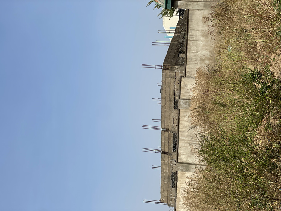 The scene depicts an undeveloped or under-construction area within the city of Unknown, Unknown, under a clear, light blue sky. In the foreground, dry, tall, light brown grasses and weeds with interspersed green shrubs occupy the lower third of the image. Directly behind the vegetation, a gray concrete perimeter wall stretches horizontally across the midground. Coiled barbed wire is affixed along the top of this wall. Above the wall, the unfinished upper section of a structure constructed from gray concrete blocks is visible. Multiple vertical metal rebar rods protrude upwards from the top course of these blocks, indicating ongoing construction. In the far right background, partially obscured, are sections of a green-roofed structure, light blue pipes, and a white building. No individuals are present, and no actions or interactions are depicted. The environment suggests dry, sunny weather conditions.
