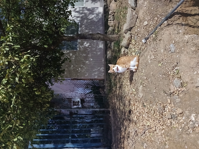 This image, captured in Altagracia, Venezuela, presents an outdoor scene during daylight hours. Centered in the mid-ground, an adult domestic cat with orange and white fur sits upright on a small, elevated patch of dry, reddish-brown earth. The cat wears a red collar and its gaze is directed towards the viewer. The immediate foreground consists of dry soil littered with scattered dry leaves and small rocks. A dark-colored pipe, possibly part of an irrigation or utility line, runs diagonally from the lower right edge of the frame, disappearing into a shallow trench or depression. In the background, to the left, a dark blue or grey metal gate is visible, partially obscured by the green foliage of an overhanging tree. Adjacent to the gate, a chain-link fence runs along a wall, with a small, rectangular, light-colored box-like fixture attached to the wall. To the right of the cat and behind it, a tree with a slender trunk and dense green leaves stands, casting prominent shadows onto a light-colored, possibly white or pale grey, building. This building features at least two visible windows. The ground surrounding the tree's base contains several large rocks and sparse green vegetation. The overall lighting suggests a sunny environment.