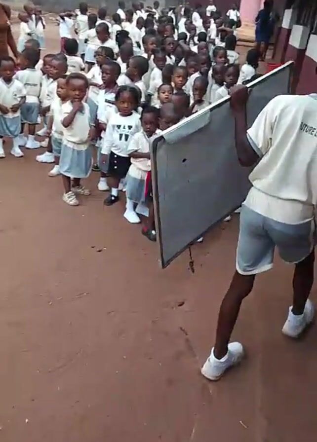 group of children, mostly in school uniforms, standing in a line outside a building. A person wearing a "Future Leader" shirt is carrying a large board along the line. The children seem to be waiting, possibly to enter the building. The surroundings are a schoolyard with a building in the background. The ground is reddish in color. Several adults are standing nearby.