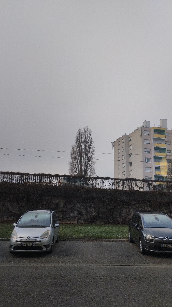 This image depicts an outdoor urban scene in Schiltigheim, France, under an overcast, light grey sky. In the immediate foreground, an asphalt surface, possibly a parking lot or road, is visible. Two Citroën C4 Picasso vehicles are parked facing the viewer. The silver vehicle on the left bears French license plate BY-801-LB. The dark grey vehicle on the right displays French license plate DK-049-MP. Both vehicles exhibit frost accumulation on their windshields and roofs. Behind the parked cars, a narrow strip of frost-covered green grass precedes a dark, dense hedge or wall covered in dry vines, running horizontally across the frame. Above this barrier, a metal fence structure is partially visible. Multiple parallel power lines or utility wires stretch across the midground horizontally. Directly behind the hedge and power lines, a tall, slender, leafless deciduous tree stands centrally, silhouetted against the sky. Faintly visible behind the fence and below the power lines are other vehicles, including what appears to be a white truck and a dark car on a higher level. In the background, to the right, a multi-story residential building with light-colored facades is visible. The building features numerous windows with white frames and several balconies, some of which are colored yellow and blue. Antennas or communication equipment are mounted on the building's roof and side. No individuals are discernibly present in the scene.