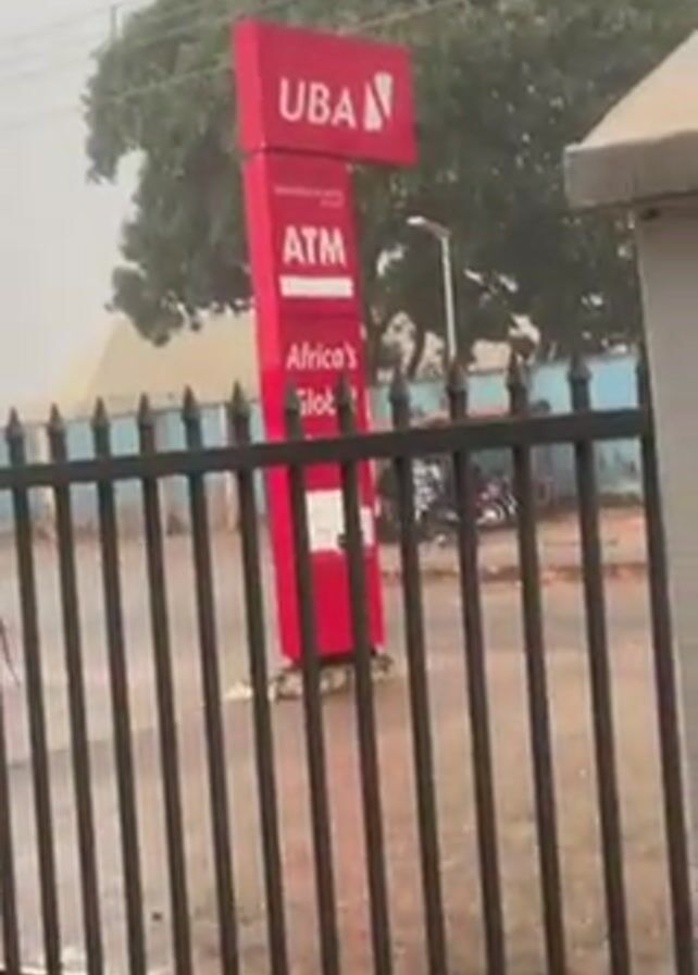 rainy day at a UBA (United Bank for Africa) location. Through a black metal fence, we see a red UBA sign that reads “UBA, ATM, Africa’s Global Bank”. The road is wet, reflecting the light, and water is visible on the fence. A motorbike with two people on it is seen behind the sign. There are trees in the background and some buildings in the distance. The overall atmosphere is hazy and damp due to the rain.