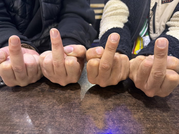A close-up photograph depicts four human hands, each with its middle finger extended upwards, resting on a dark brown, textured surface. This surface, possibly a wooden or laminate tabletop, exhibits minor reflections including a distinct blue light source positioned centrally at the bottom. The two left hands belong to an individual wearing a dark, possibly black, jacket. The two right hands belong to a separate individual, whose torso is partially visible, wearing a jacket characterized by cream-colored textured fabric and dark sections, with an additional yellow and green element. All visible hands display a similar light-to-medium skin tone, with visible knuckle hair and fingernails that appear trimmed, some showing minor subungual discoloration. The background is out of focus and indistinct, consistent with an indoor environment. This scene is located in Salé, Morocco.