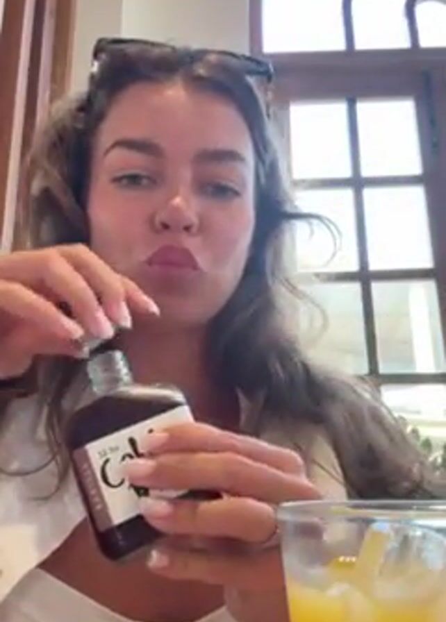A woman with long curly brown hair and sunglasses on her head is pouring cold brew from a small glass bottle into a glass of orange juice