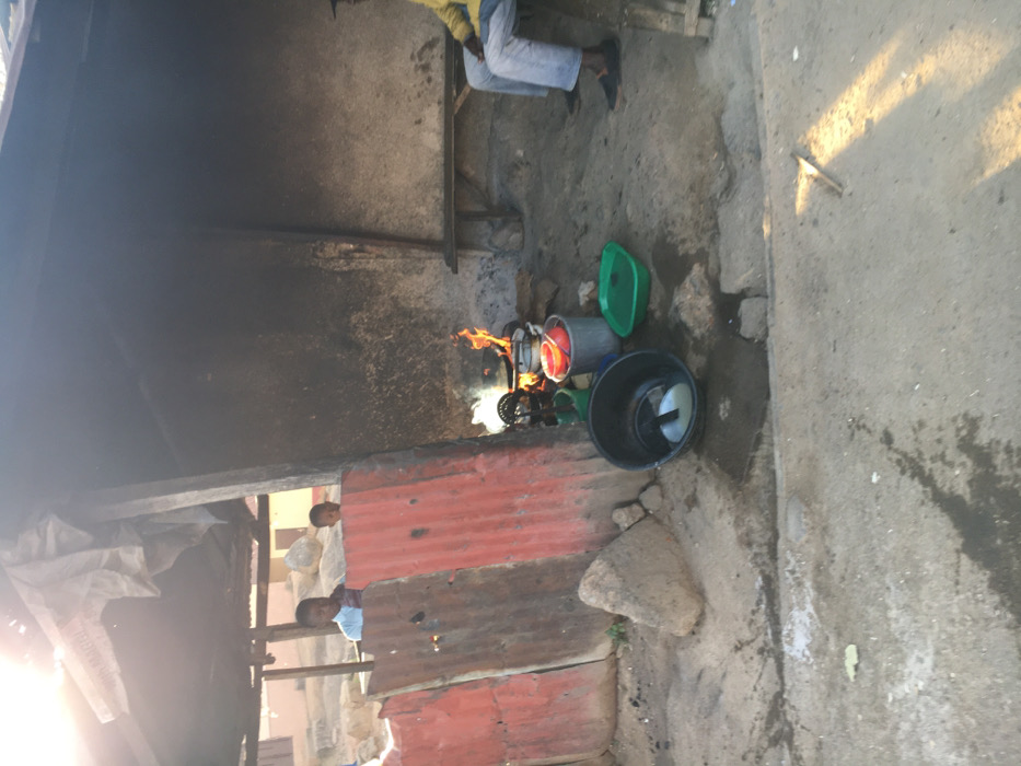 This image depicts an outdoor cooking and informal gathering area in Jos, Nigeria, under direct sunlight, likely morning or late afternoon given the lighting angle