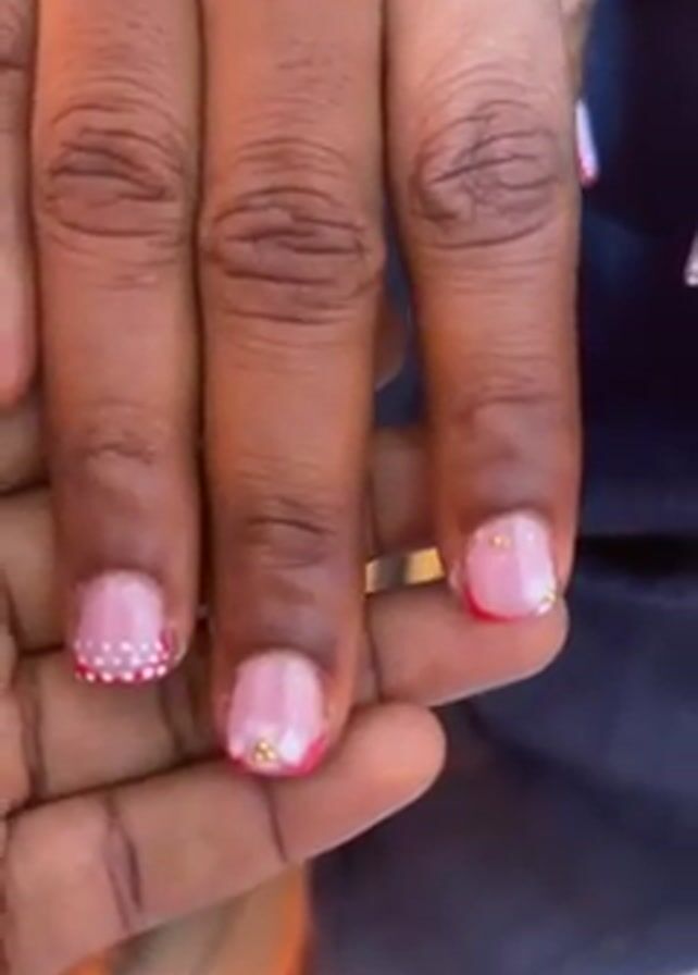 A close-up shot shows a person holding two hands, presumably to show off a manicure. The manicured nails have a pale pink base with red tips. One of the hands has gold beads in the corner of the nails, while the other has a row of white dots on each nail. One of the hands has a gold band on the ring finger. The background is dark blue.