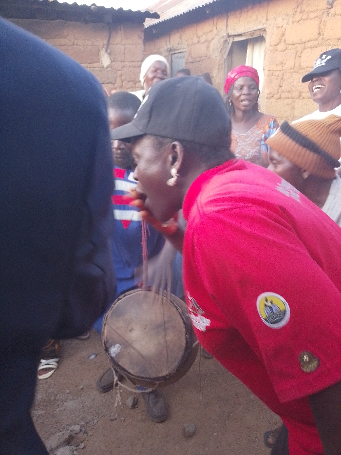 A woman wearing a red shirt and a black baseball cap bends over a small drum, appearing to play it with a string held in her mouth. Several other people stand around, some smiling. The drum sits on the ground between shoes. Behind them is a clay brick building with a corrugated metal roof. One woman wears a headscarf, and another is wearing a knit beanie.