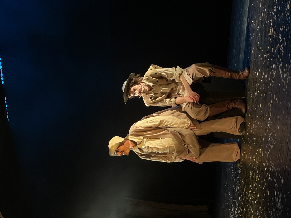 Two male individuals in theatrical costumes are depicted on an indoor theatrical stage in Novoshakhtinsk, Russia. The stage floor is dark, uniformly covered with scattered white particulate matter. Elevated blue stage lights are visible along the upper edge of the frame. The subject on the left stands, positioned slightly to the right, with his body turned partially left and his head turned sharply right, looking off-frame. He wears a light-toned, long-sleeved shirt, wide-legged trousers, and a matching light-colored cap. A light beige satchel with a flap closure is slung across his right hip. He has a visible mustache, and his mouth is slightly open, suggesting an expression of reaction or speech. The subject on the right is seated on a dark, indistinct object, facing forward with his head slightly turned left, gazing in that direction. He is attired in a light-colored, long-sleeved shirt, a sleeveless overgarment with multiple dark circular embellishments, light brown breeches, and tall, dark brown lace-up boots. He wears a dark, wide-brimmed hat over dark, curly hair, and possesses a prominent dark mustache and a small soul patch. His hands are clasped together in his lap. Both subjects are illuminated by directed spotlights from above, casting light primarily on their upper bodies and costumes against a largely black, undefined background. Faint vertical lines, possibly representing stage elements, are visible on the far left of the background.