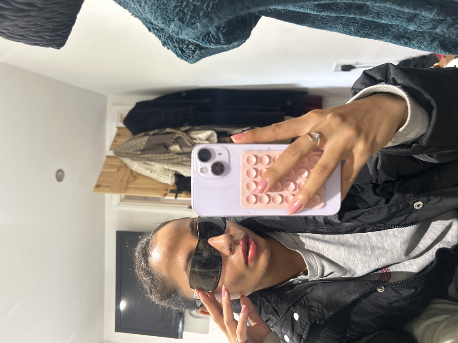 An adult female is captured in a mirror selfie within an indoor room. She wears dark, rectangular sunglasses with silver temple accents, a black puffer jacket over a grey long-sleeved top, and red lipstick. A small stud nose piercing is visible. Her fingernails are painted pink. She holds a light purple smartphone, featuring a pale pink silicone suction-cup grip on its rear case, in her left hand, which also displays a silver ring on the ring finger. Her right hand is raised, with fingers touching the right temple of her sunglasses. In the background, a black flat-screen television is mounted on a white wall to the left. A light brown wooden door, slightly ajar, is visible in the center-right. Behind the door, a coat rack holds several garments, including a light-colored patterned scarf and a dark coat. A dark green textured garment is partially visible on the far right. The room has white walls and a white ceiling with a single recessed light fixture. The location in the city of Winslow, United Kingdom, cannot be determined from the image contents.