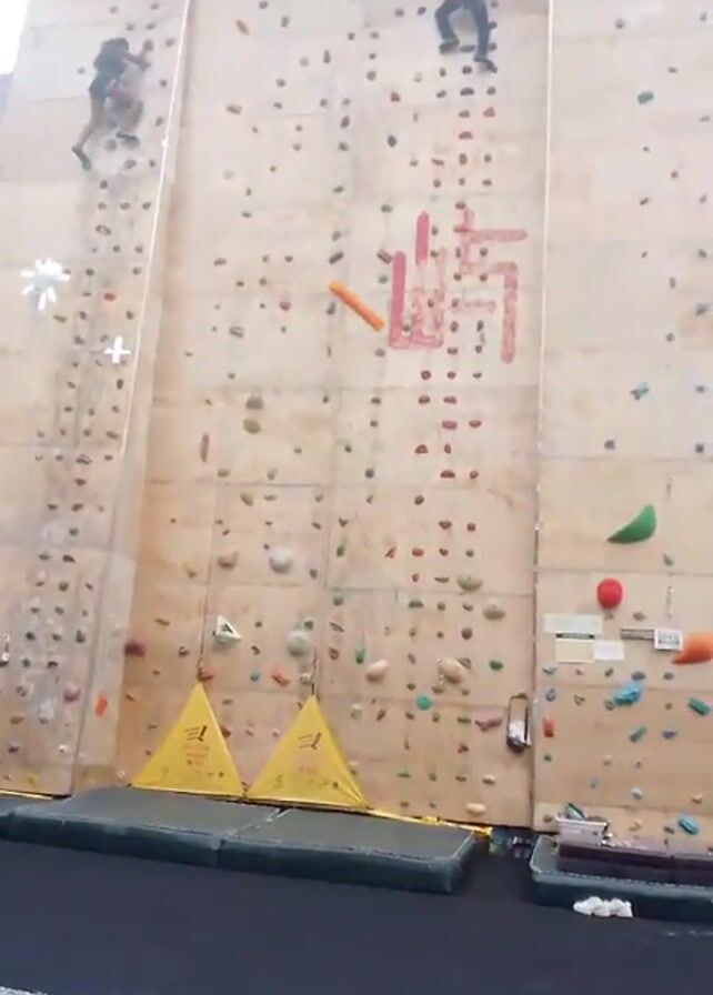 two people climbing a climbing wall in an indoor facility