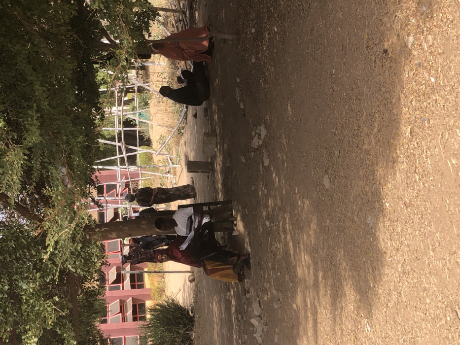 The scene depicts an outdoor gathering under the shade of trees in Dabawa, Nigeria, on unpaved reddish-brown ground scattered with small rocks and debris