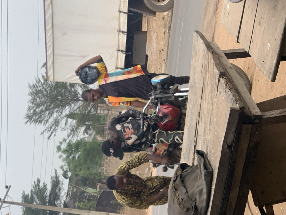 Three men are on a motorbike near a road. The first man is holding a black helmet. He's wearing a black shirt and a colorful jacket. The second man is wearing a patterned shirt and a baseball cap. The third man is wearing a yellow shirt. A parked truck is behind them. A weathered wooden table is in the foreground.