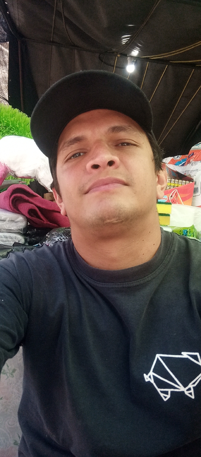 A frontal close-up depicts an adult male positioned centrally. He has light brown skin, dark hair partially covered by a black baseball cap worn brim-forward, and a dark-colored short-sleeved t-shirt with a white geometric pig logo on the left chest. A small horizontal scar is visible on his chin below his lower lip. He looks directly into the camera with a neutral expression. The background indicates an indoor or semi-outdoor commercial stall. To the subject's left, stacked items include a bright green, textured object resembling artificial grass, folded burgundy fabric, and white and dark-colored plastic-wrapped packages. To his right, various retail goods are stacked, including yellow sponges and multi-colored packaging. Overhead, a dark tarp or canopy is visible, supported by yellow cords or cables, with a single, unshaded light bulb providing illumination. The exact location within Caracas, Venezuela, cannot be determined from the visual evidence in the image.