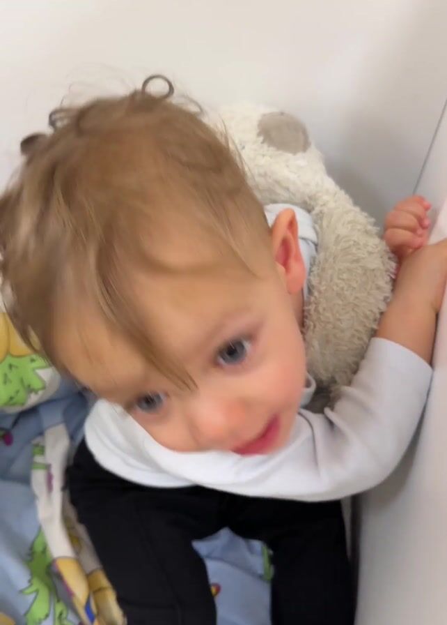 Here is a detailed description of the video: A very young child is sitting in a crib and looking up