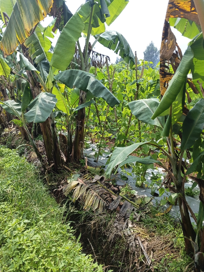 A dense, lush agricultural scene unfolds with banana trees dominating the foreground. Their large green leaves intermingle with the smaller, upright vegetation behind them, possibly a legume crop supported by stakes. Rows of plastic sheeting line the ground between the plants, indicating a deliberate planting strategy. A ditch overgrown with weeds runs along the edge of the banana plants. The overall impression is of a thriving, mixed agricultural landscape.