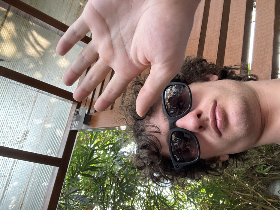 A person with curly hair and black sunglasses lies facing upwards, a hand partially obscuring their face. The sunglasses reflect a busy scene. The background includes greenery like bamboo and a structure with transparent panels. A wooden frame is visible near the top. The person's nose and lips are prominent.