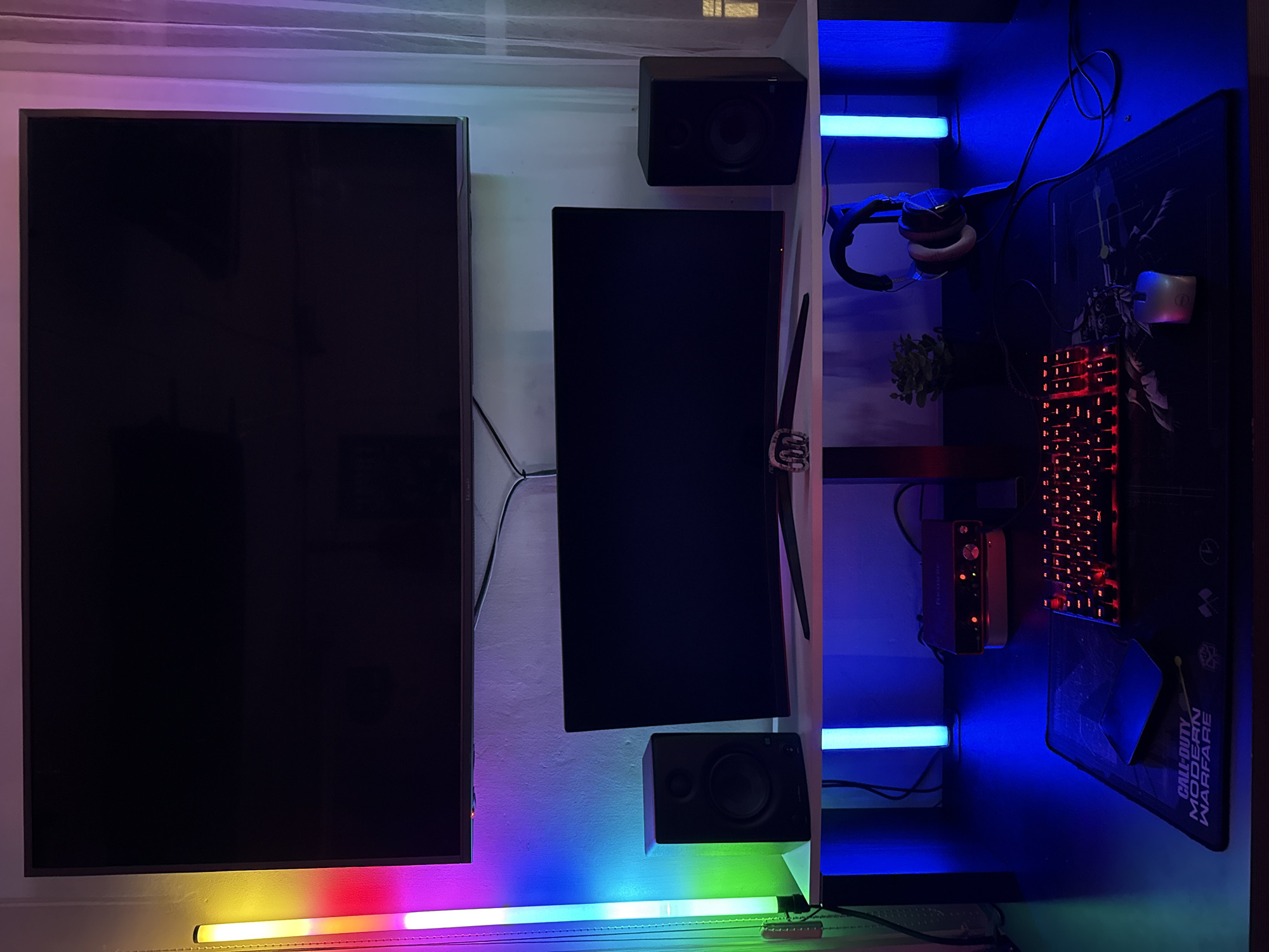 The image depicts a gaming setup. On the left is a large flat-screen television mounted on a wall. To its right is a smaller computer monitor, flanked above and below by black box speakers. Below the television is a color-changing light tube. On the right side of the image is a desk. A gaming keyboard with red backlighting sits on a large mousepad featuring "Call of Duty: Modern Warfare" branding. A gaming mouse rests on the mousepad. A pair of headphones hangs near the top right corner of the desk. A small green plant sits below the headphones, next to an amplifier. Light tubes emit blue light. No people are visible. The location in Riga, Latvia, cannot be determined from the image.