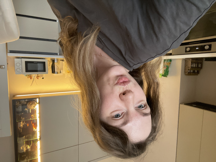 A woman with long blonde hair and blue eyes is looking at the camera with pursed lips. She is wearing a grey shirt. The background shows a modern kitchen with white cabinets and countertops. A microwave, oven, and lighted display cabinet are visible. The image is rotated, so the scene appears upside down.